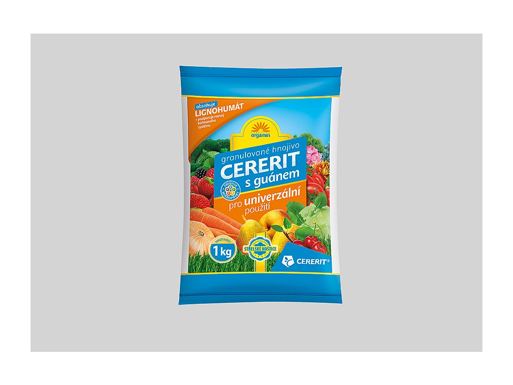 CERERIT S GUÁNEM je organominerální granulované hnojivo se stopovými prvky, určené k výživě ovoce, zeleniny a okrasných rostlin. Výrobek obsahuje minimálně 60% originálního hnojiva CERERIT GSH NPK 8-13-11.