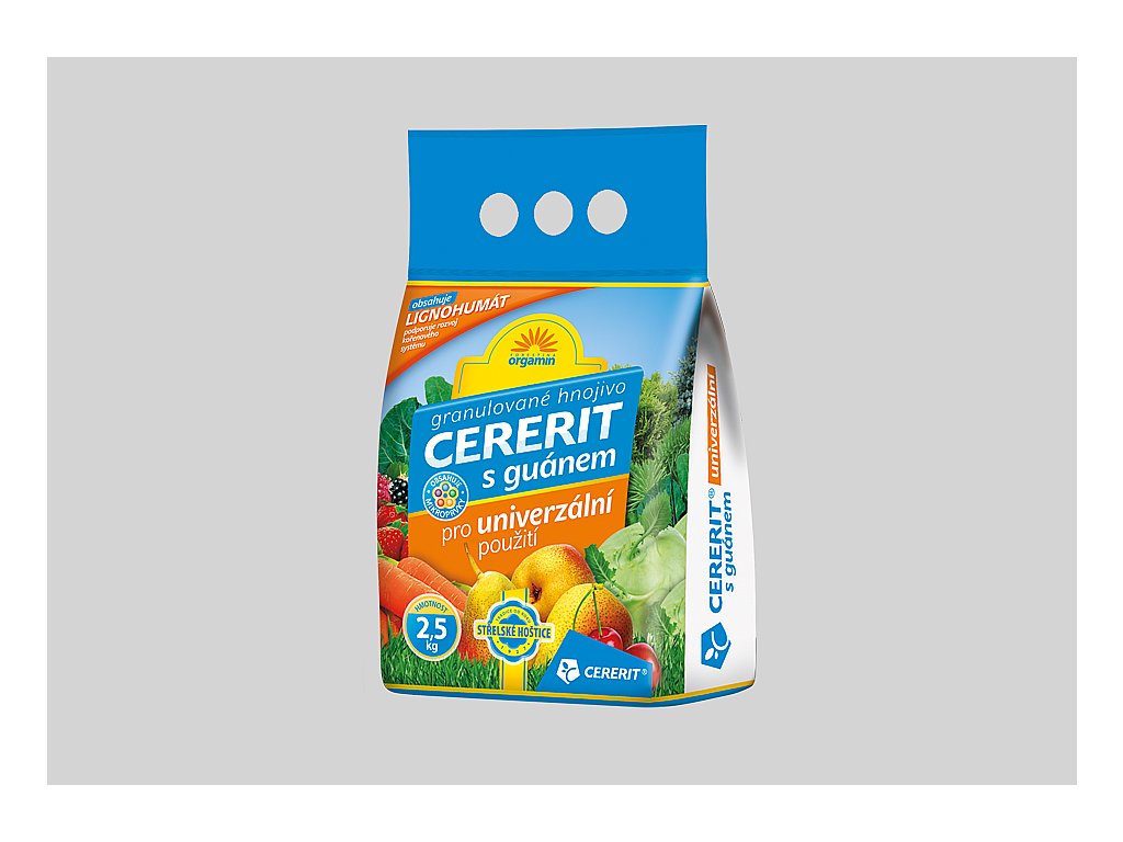 CERERIT S GUÁNEM je organominerální granulované hnojivo se stopovými prvky, určené k výživě ovoce, zeleniny a okrasných rostlin. Výrobek obsahuje minimálně 60% originálního hnojiva CERERIT GSH NPK 8-13-11.
