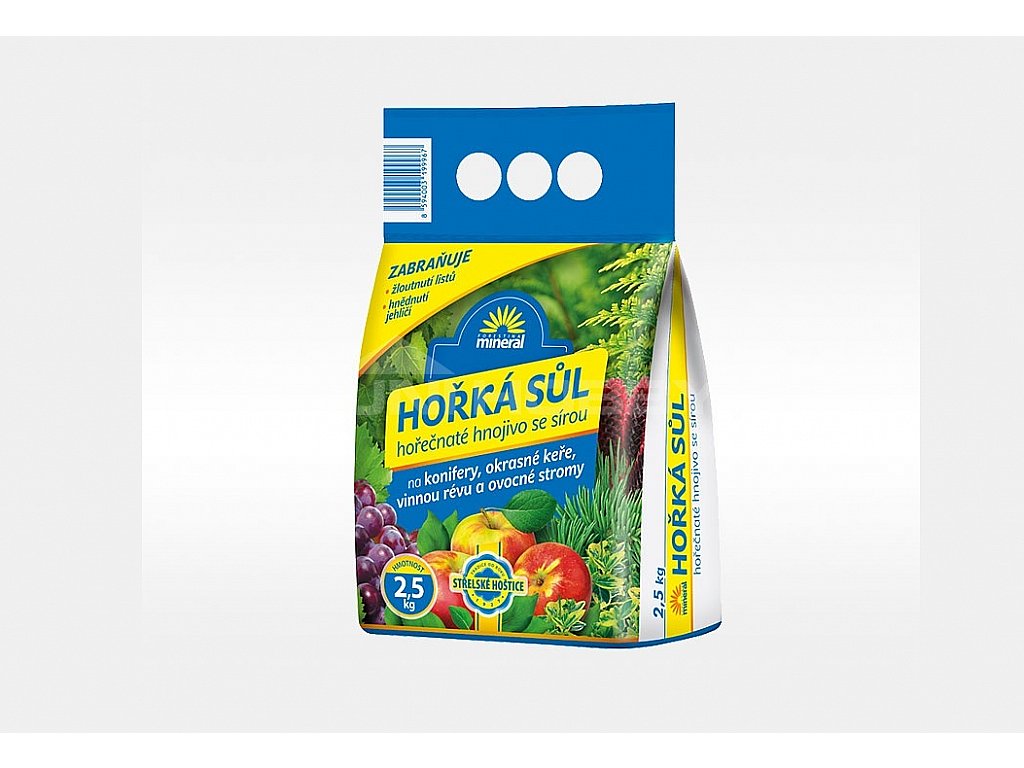 Hořká sůl ( síran hořečnatý ) je rychle působící a bezezbytku rozpustné krystalické hnojivo s vysokým obsahem hořčíku. Hořčík je velice důležitou složkou výživy rostlin. Je stavební látkou zeleně listové ( chlorofylu ), která zajišťuje životně nezbytnou fotosyntézu. Při nedostatku hořčíku v půdě jsou rostliny postiženy tzv. chlorózou, která se projevuje žloutnutím listů mezi žilnatinou ( žilky zůstávají zelené ) a hnědnutím jehličí u jehličnanů. V důsledku toho se postižené rostliny nevyvíjejí správně, výnosy jsou malé, jakost plodů nízká.
