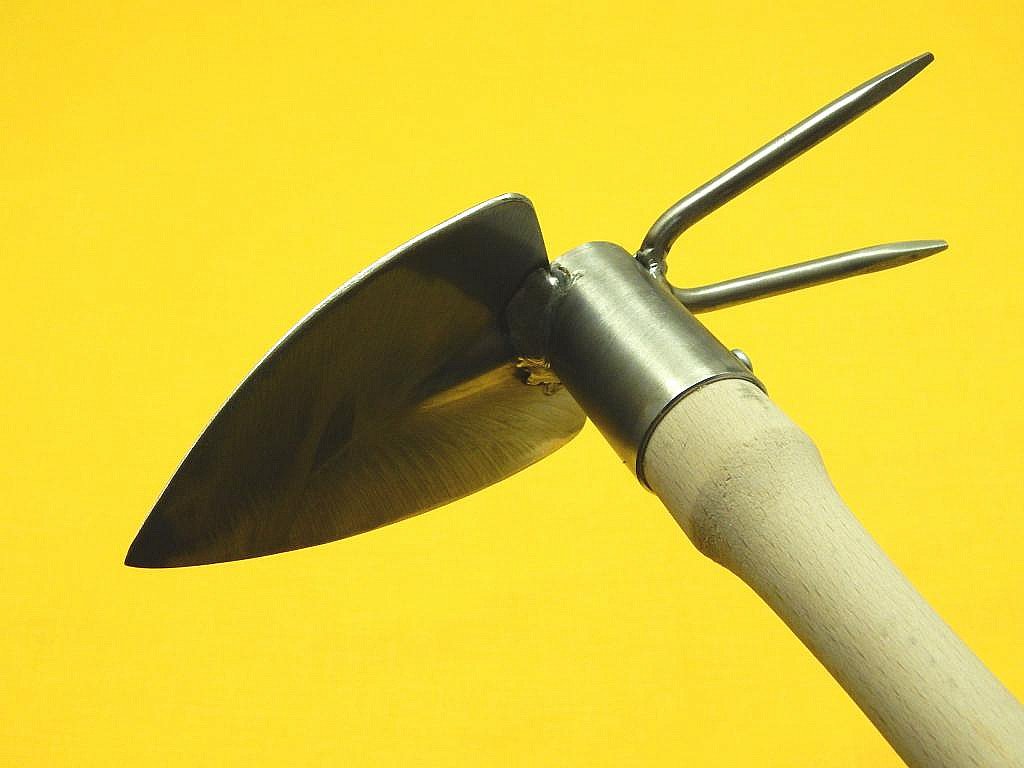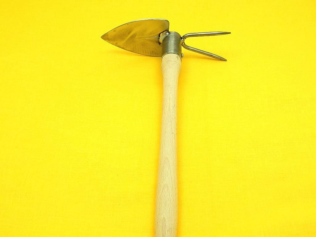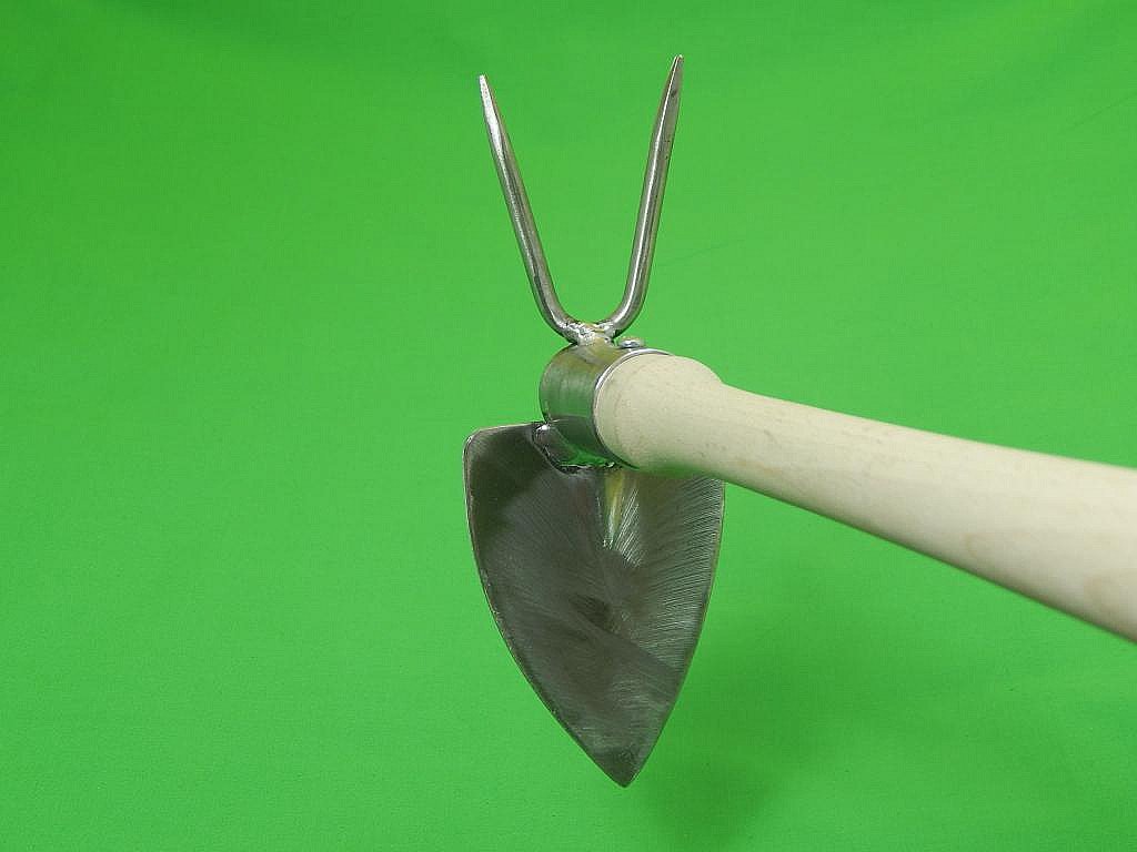 Pevná celonerezová motyčka s broušenou násadou a dvojitýn parůžkem. Motyčka má u sváru pevnostní prolis proti ohnutí. Je možno nasadit na delší násadu průměru 28 mm.