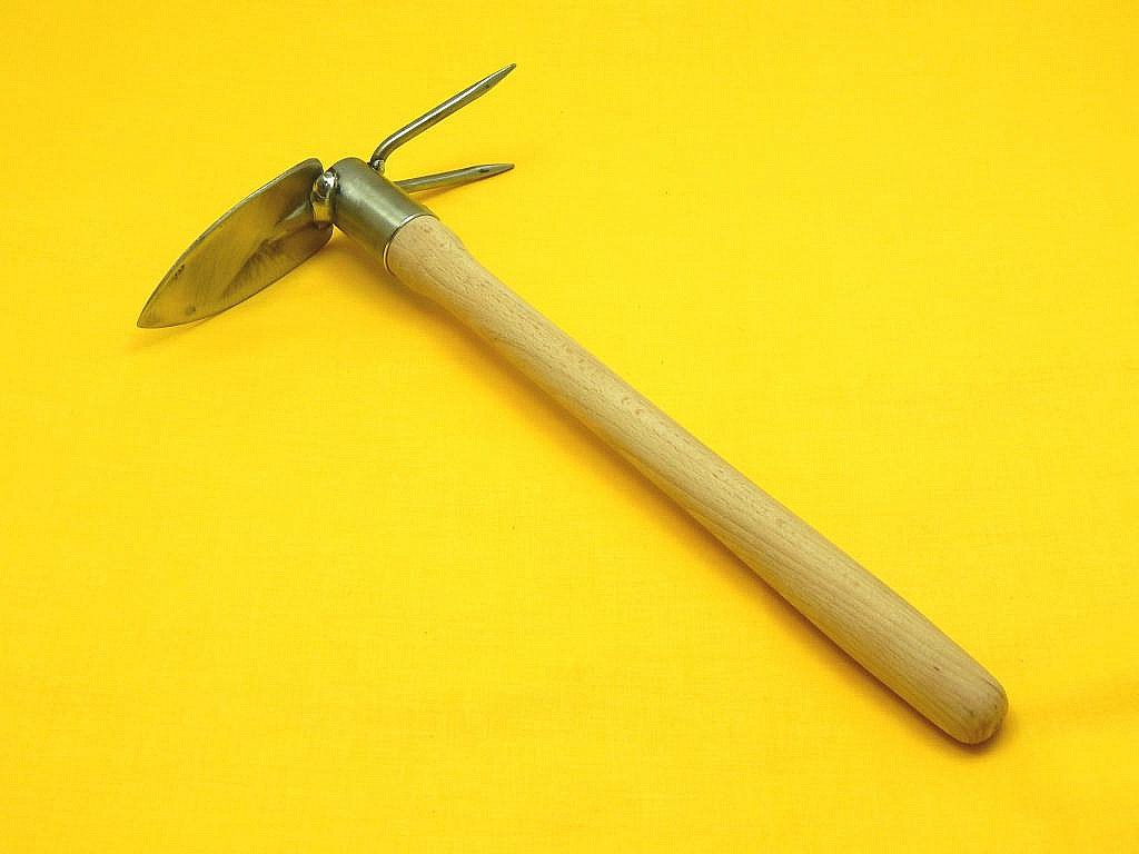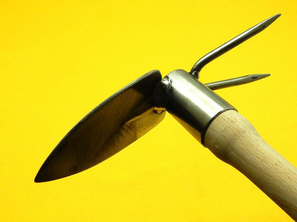 Pevná celonerezová motyčka s broušenou násadou a dvojitýn parůžkem. Motyčka má u sváru pevnostní prolis proti ohnutí. Je možno nasadit na delší násadu průměru 28 mm.